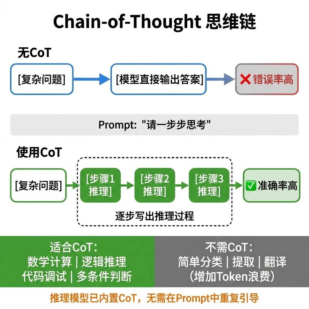 推理模型(概念5)可以理解为内置了CoT机制,模型自动执行思维链推理,不需要Prompt中手动引导。如果产品已用推理模型,再加一步步思考只是浪费Token。