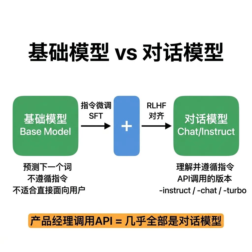 你通过API调用的几乎全部是对话模型。基础模型更多用于需要最大化生成多样性的场景,比如生成训练数据、创意实验。看模型文档时,直接跳到对话版本的章节即可。