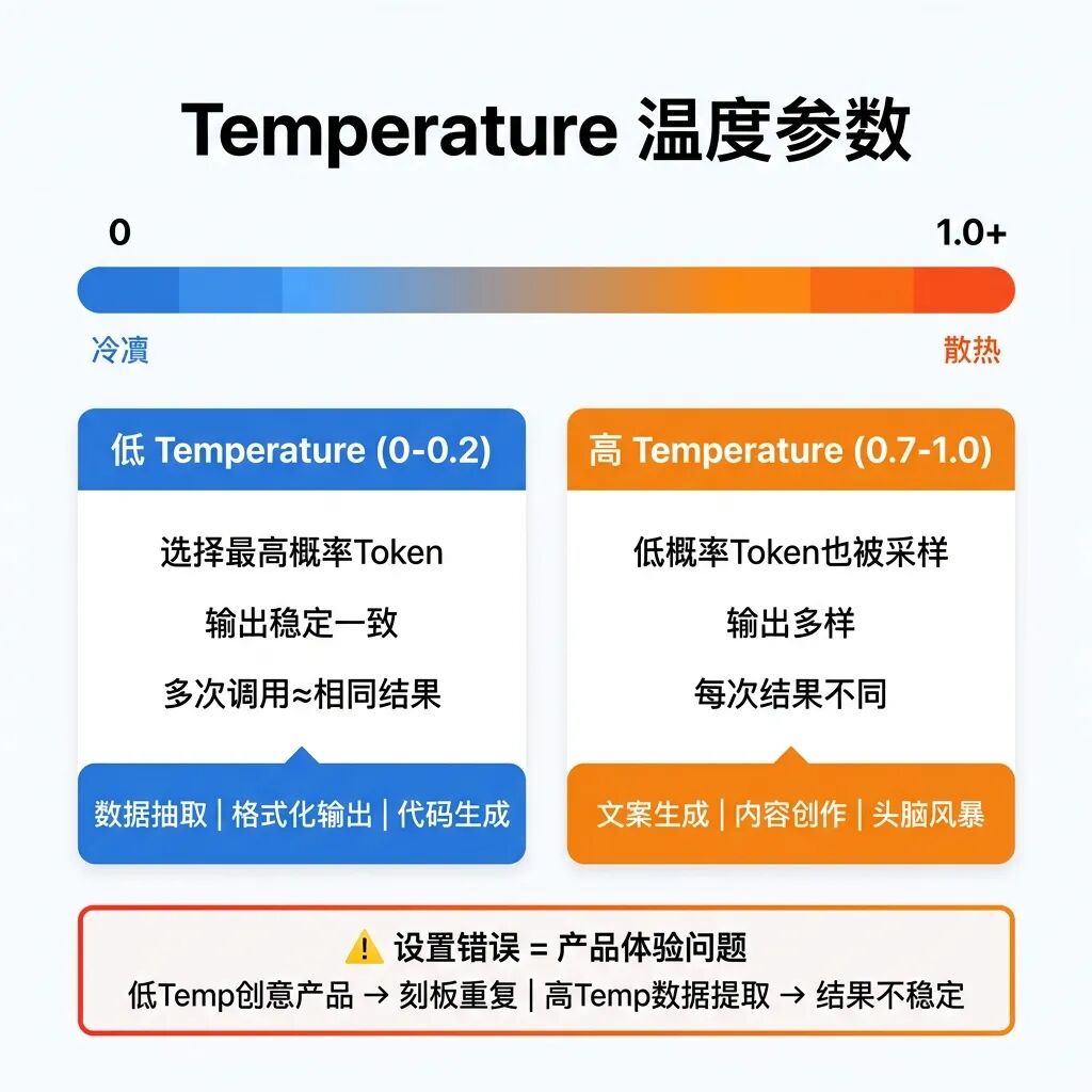 Temperature设置错误是很多产品早期体验问题的直接原因。低Temperature的创意产品会显得刻板重复,高Temperature的数据提取产品会输出不稳定的字段值。上线前先根据业务场景确定Temperature值,写进配置文档。