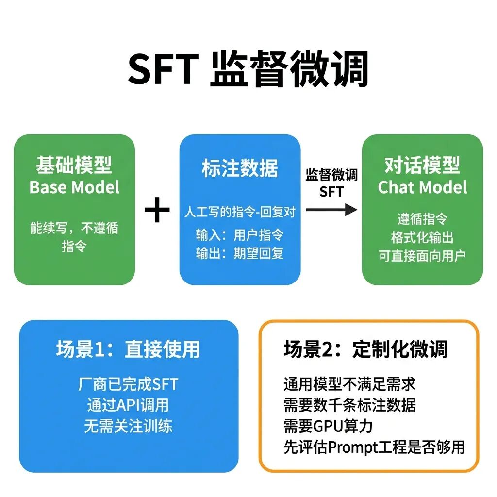 SFT(Supervised Fine-Tuning,监督微调) 是在预训练模型基础上,用人工标注的指令-回复数据对进行有监督训练,使模型具备遵循指令的能力。这是从基础模型到对话模型的关键步骤。
