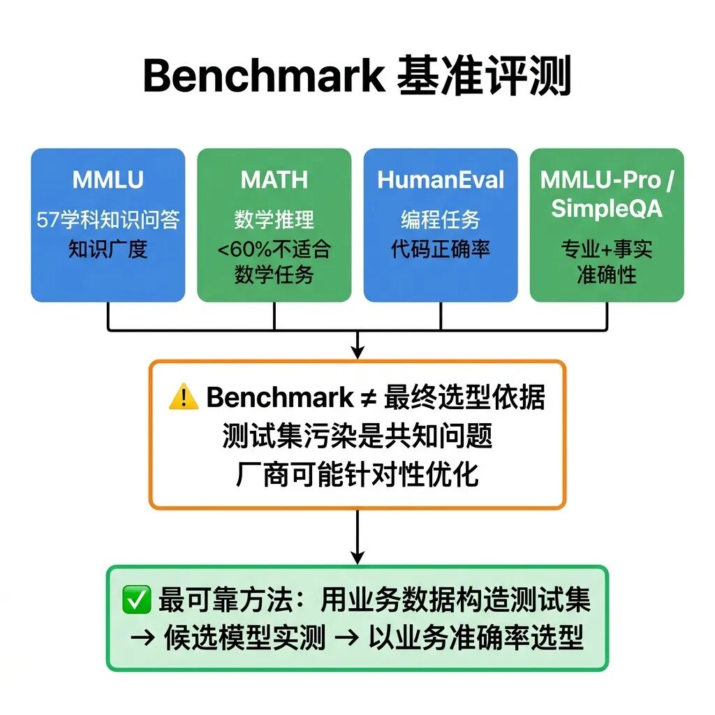 Benchmark(基准评测) 是用于衡量大模型能力的标准化测试集,选型时需要参考但不能只看这个。