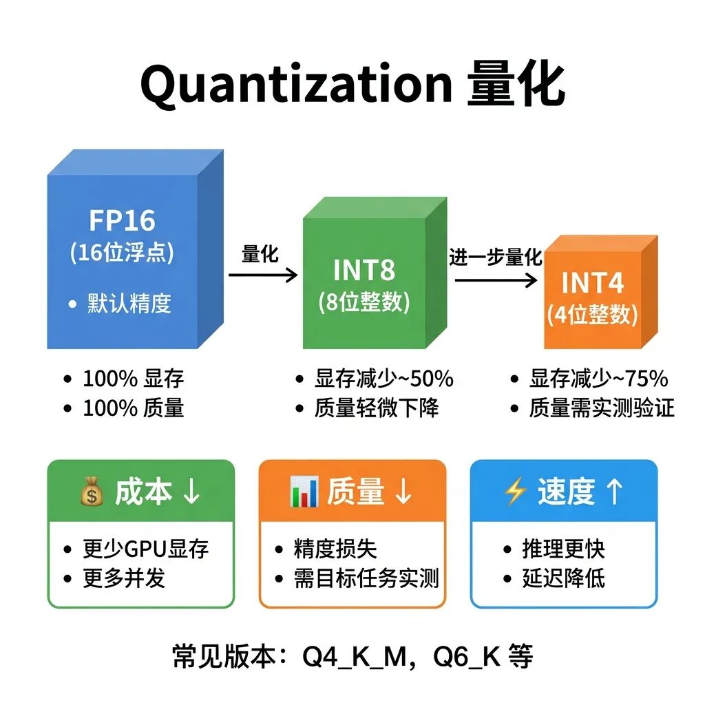 部署一个大参数模型需要的GPU显存动辄几百GB,硬件预算直接爆掉。Quantization是把硬件成本砍下来的核心手段。
