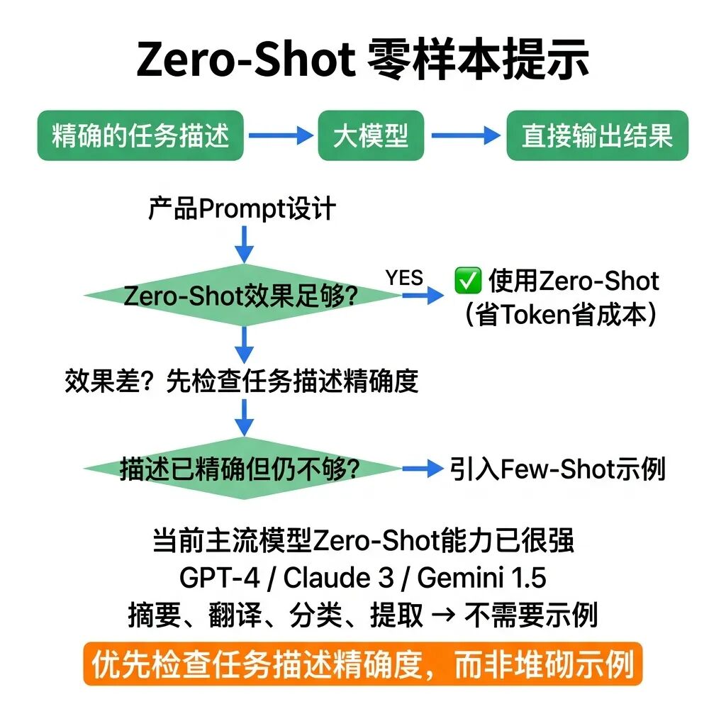 设计Prompt时先用Zero-Shot试效果,如果输出格式或质量不满足要求,再引入Few-Shot。不要默认加入大量示例,因为示例会增加Token消耗和推理延迟。