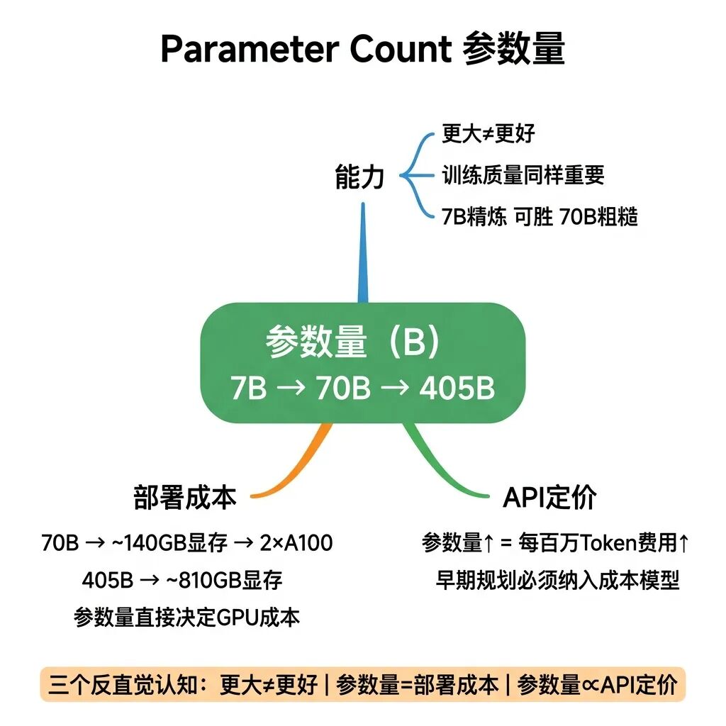 Parameter Count(参数量) 是模型中可训练权重的总数量,通常以十亿(Billion,B)为单位,如7B、70B、405B。
