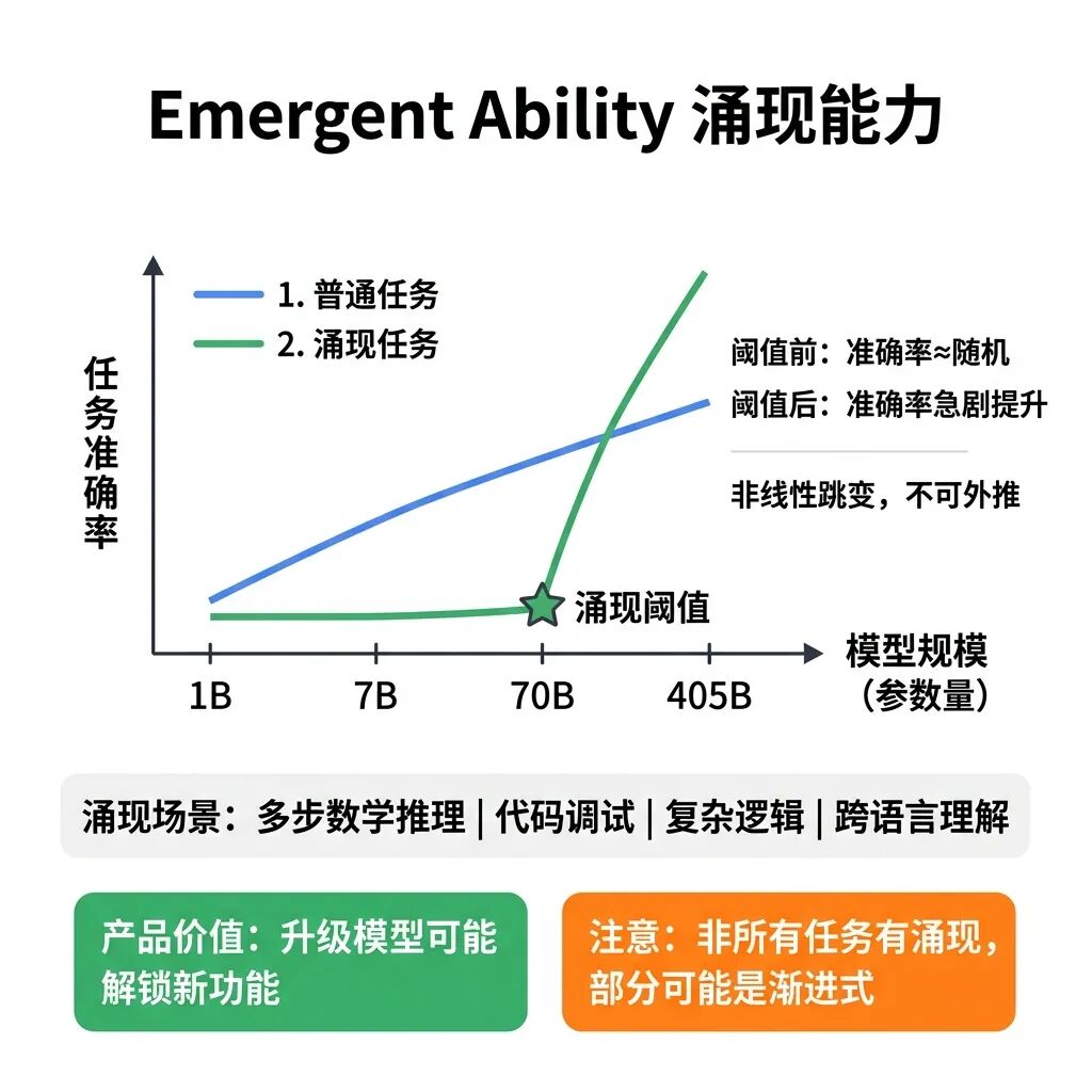 Emergent Ability(涌现能力) 是指大模型在参数量或训练数据规模达到某个阈值后,突然具备之前没有的能力,且该能力无法从更小规模的模型线性外推。