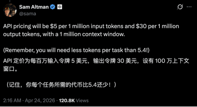 在定价上,GPT-5.5 API为每百万输入token 5美元、输出30美元,Pro版本更高。这个价格是GPT-5.4的两倍。