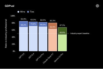 其中最值得关注的指标是GDPval,这个测试不是传统选择题,而是用44种真实职业任务来评估模型,比如分析数据、写报告、做判断。
