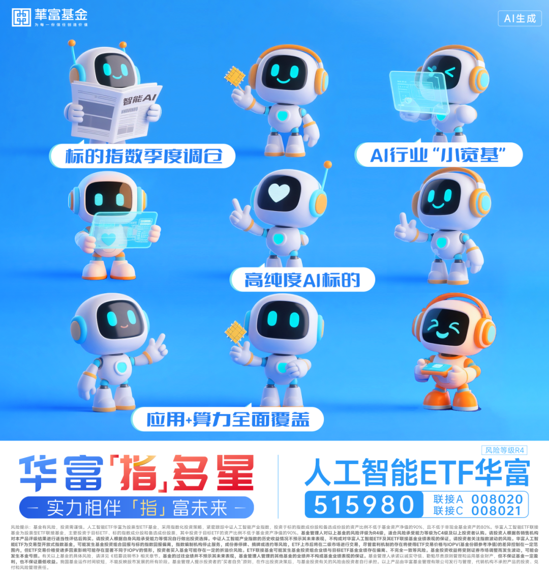 华富人工智能ETF为股票型ETF基金,采用指数化投资策略,紧密跟踪中证人工智能产业指数,投资于标的指数成份股和备选成份股的资产比例不低于基金资产净值的90%,且不低于非现金基金资产的80%;华富人工智能ETF联接基金为股票型ETF联接基金,主要投资于目标ETF、标的指数成分股和备选成份股票,其中投资于目标ETF的资产比例不低于基金资产净值的90%。指数的历史收益情况不预示其未来表现,不构成对相关基金业绩表现的保证,请投资者关注指数波动的风险。ETF上市后将在二级市场进行交易,尽管套利机制的存在将使得ETF交易价格与IOPV(基金份额参考净值)的差异控制在一定范围内,但ETF交易价格受诸多因素影响可能存在显著不同于IOPV的情形,投资者买入ETF可能存在一定的折溢价风险。ETF可能发生基金投资组合业绩与标的指数业绩存在偏离、指数编制机构停止服务、成份券停牌或违约等风险。联接基金可能发生基金投资组合业绩与目标ETF基金业绩存在偏离、不完全一致等风险。