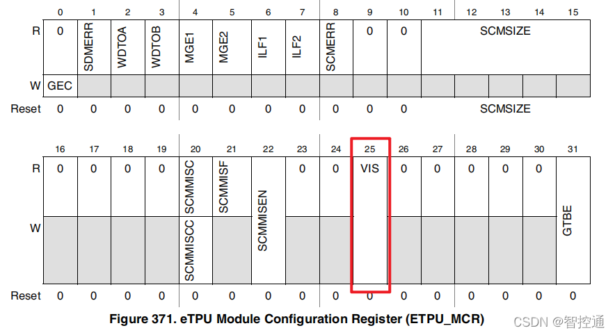 - ETPU_MCR: eTPU模块配置寄存器,ETPU_MCR收集eTPU系统中的全局配置和状态,包括全局异常