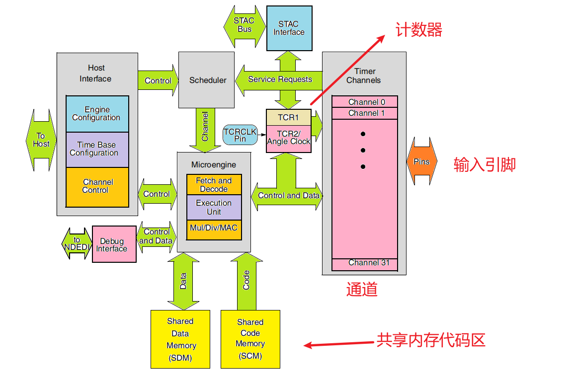 eTPU2是一个实时微处理器子系统。因此,它从指令存储器(SCM)中运行微引擎代码来处理特定的事件,并为参数、工作数据和应用程序状态信息访问数据存储器(SDM)。事件可以来自I/O通道(由于引脚转换和/或时间基础匹配)、设备核心请求或通道间请求。调用本地eTPU处理的事件通过发出服务请求来激活微引擎。服务请求微码可以向设备核心发送一个中断,但设备核心不能被I/O通道事件直接中断。