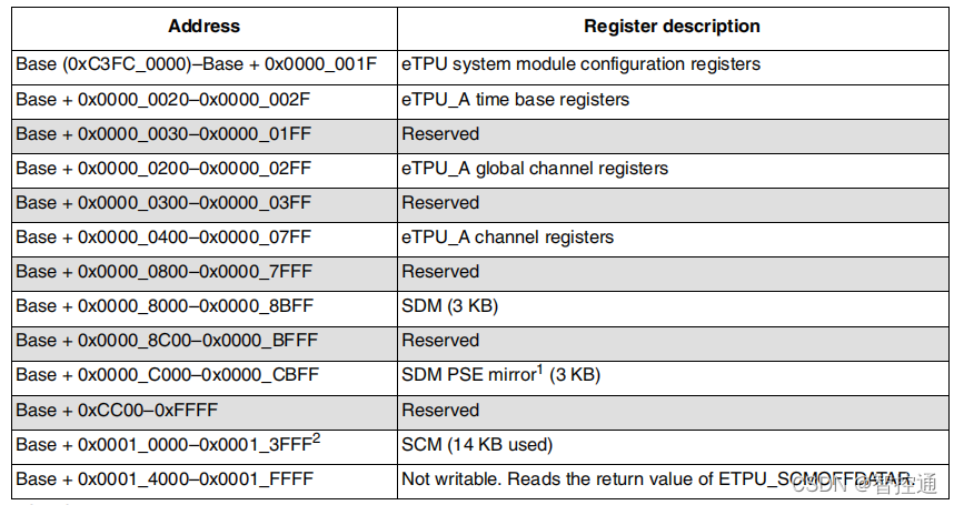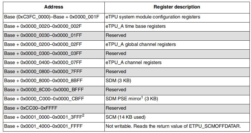 - 模块禁用模式 :节省电源(停止输入采样),eTPU2引擎可以独立地处于禁用模式。模块禁用模式只停止eTPU引擎时钟,以便可以访问共享的BIU和全局通道寄存器