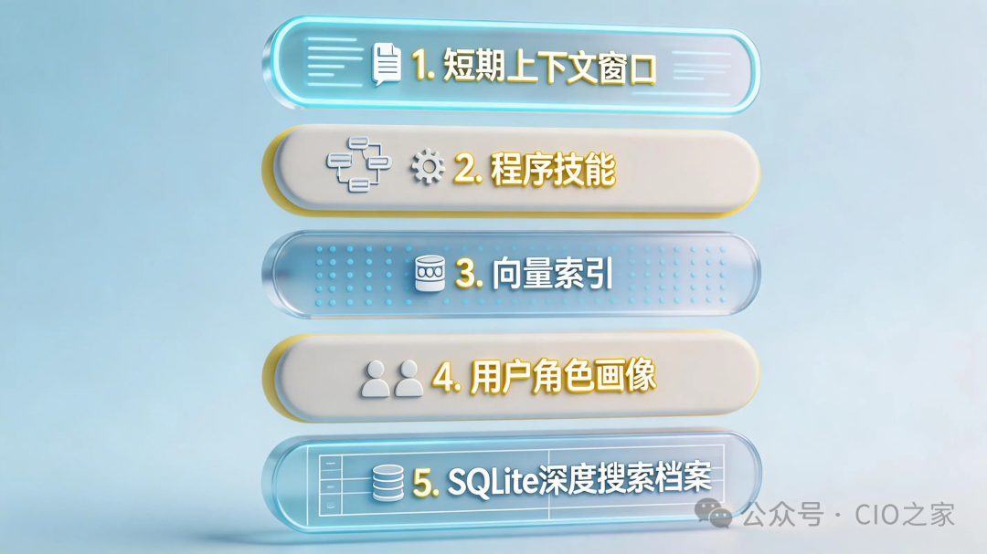| 层级 | 名称 | 存储内容 | 持久化 | 技术实现 | | — | — | — | — | — | | Layer 1 | 短期推理记忆 | 当前会话的对话历史 | 会话内 | 上下文窗口 | | Layer 2 | 程序性技能文档 | 可复用的任务执行方案 | 永久 | agentskills.io 标准 Markdown | | Layer 3 | 上下文持久化 | 技能文档的向量索引 | 永久 | 向量存储 + 语义检索 | | Layer 4 | 用户建模 | 用户偏好、工作风格、习惯 | 永久 | Honcho(外部服务)+ FTS5 | | Layer 5 | 对话日志 | 完整的会话历史 | 永久 | SQLite + FTS5 全文检索 |