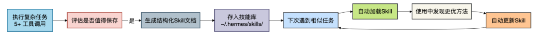 这是 Hermes 厉害的地方,也是跟其他 Agent 拉开差距的核心。Hermes 不是靠你手动编写配置文件来扩展能力,而是自己在执行复杂任务后,自动提炼出可复用的解决方案。
