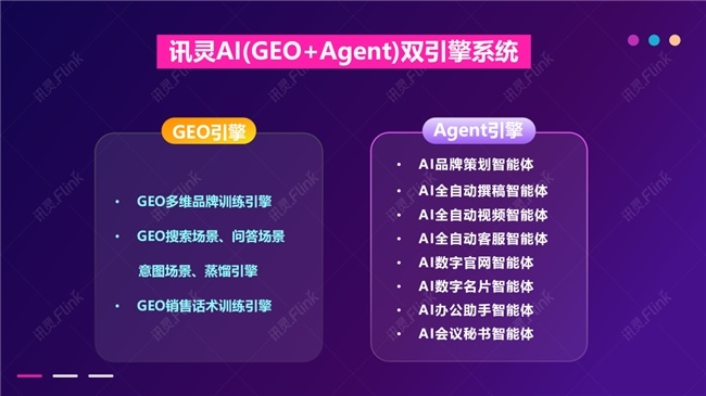 讯灵AI独创GEO引流引擎 + Agent转化引擎双核心架构,为企业打造全链路优化体系: