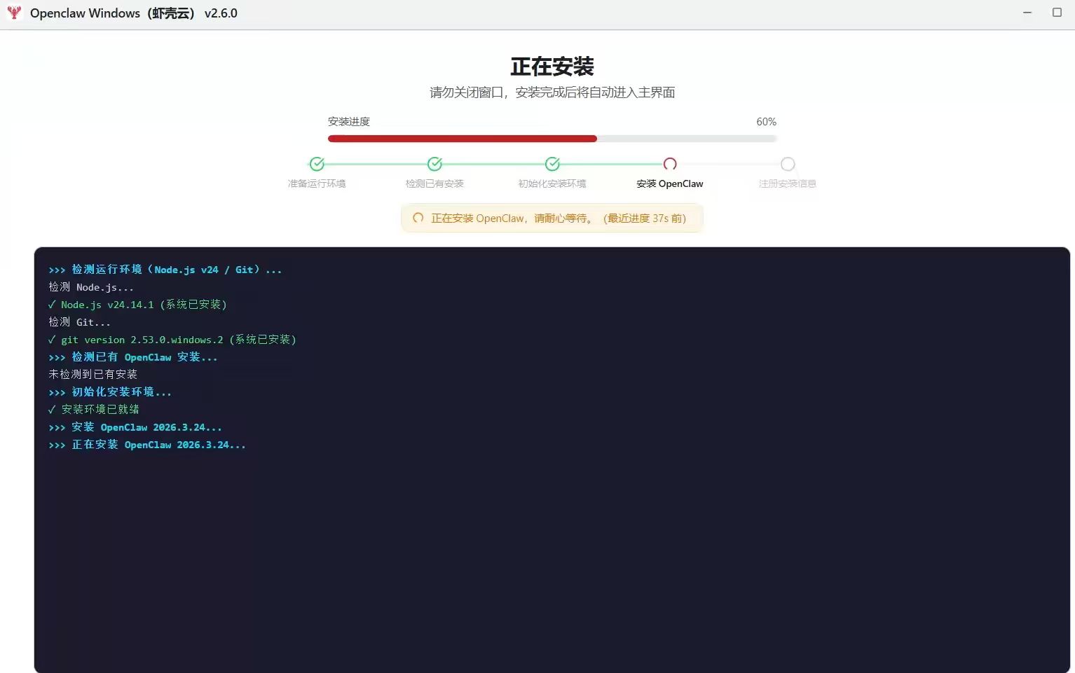 设置好路径并勾选相关协议后,点击安装按钮,程序会自动完成环境配置,全程不需要手动操作,根据设备配置不同,耗时约 3–5 分钟,期间不要关闭安装窗口。