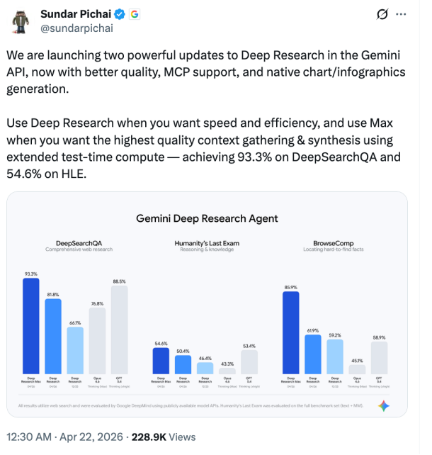 谷歌首席执行官桑达尔·皮查伊(Sundar Pichai)也亲自下场在X上吆喝:“当你需要速度和效率时,请使用Deep Research;当你追求最高质量的上下文收集与综合时,请使用Max版本——它通过扩展测试时计算,达到了DeepSearchQA 93.3%和HLE 54.6%的成绩。”