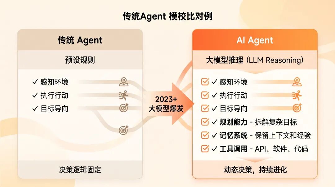 跟传统 Agent 比起来,AI Agent 的决策逻辑从预设规则变成了大模型的推理能力。