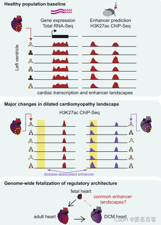 以9月20日发表在Cell Rep的论文“Genome-wide fetalization of enhancer architecture in heart disease”为例。心脏病与关键转录因子的重新表达有关,这些转录因子通常只在心脏的产前发育过程中活跃。然而,这种重新激活对心脏病的调控格局的影响尚不清楚。该研究使用RNA-seq与ChIP-seq靶向与活性转录增强子相关的组蛋白修饰,从多达26名健康对照、18名特发性扩张型心肌病(DCM)患者和5名胎儿心脏的左心室组生成全基因组增强子图谱。