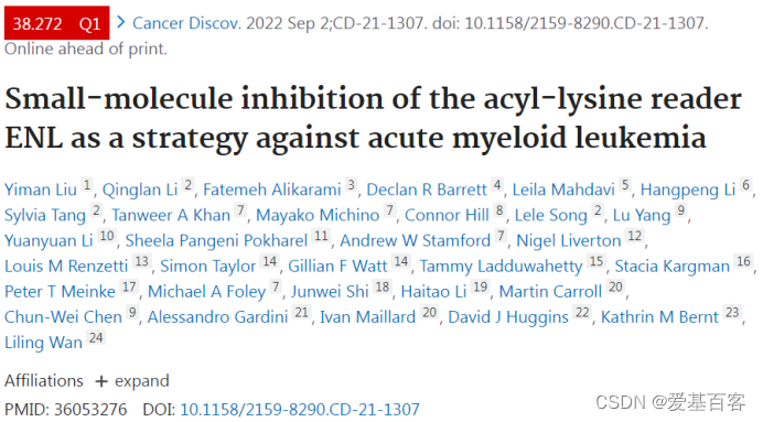 文章标题:Small-molecule inhibition of the acyl-lysine reader ENL as a strategy against acute myeloid leukemia