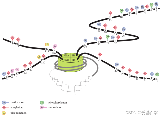 组蛋白蛋白结构在N端有一段“尾巴”,组蛋白修饰通常发生在这些尾巴上面。组蛋白修饰是以共价方式进行的蛋白质翻译后修饰,常见的组蛋白修饰包括甲基化、磷酸化、乙酰化和泛素化等。