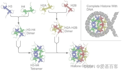 染色体的基本单位是核小体,而核小体是由DNA序列与组蛋白组成的。147bp的DNA序列缠绕在组蛋白八聚体上,组蛋白八聚体有4种组蛋白:H2A、H2B、H3和H4。