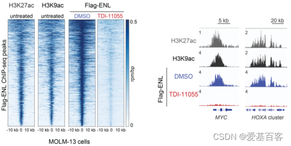 2022年9月,宾夕法尼亚大学万里玲实验室与费城儿童医院Kathrin M.Bernt实验室等在期刊Cancer Discov发表“Small-molecule inhibition of the acyl-lysine reader ENL as a strategy against acute myeloid leukemia”的研究论文。染色质阅读器ENL已被确定为急性髓细胞白血病的关键依赖性疾病,但其治疗潜力尚不清楚。在该研究中准备了一个ENL小分子抑制剂TDI-11055,其可以通过阻断ENL YEATS结构域与酰化组蛋白的互相作用。为了测试TDI-11055是否是细胞中ENL的染色质拮抗剂,研究者采用了ChIP-seq技术分析处理过的细胞。