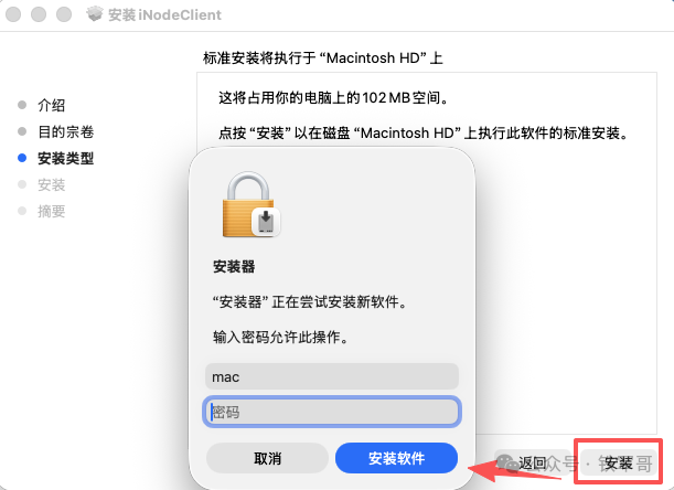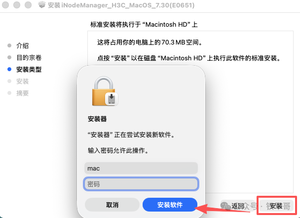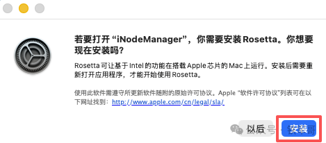 这个提示界面算是本次安装的最核心差异,可以看到,iNodeManager依旧是基于Intel芯片开发的,需要安装Rosetta,这就好比给法拉利装了一个转接头,虽然有点违和,但在M4芯片的强悍性能下,这点转接损耗几乎可以忽略不计,直接单击【安装】即可。