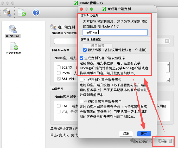 单击【完成】生成客户端,在弹出的对话框中,添加一个定制附加信息,并配置为默认场景。最后按照实际需求生成定制的客户端安装程序或升级包即可。