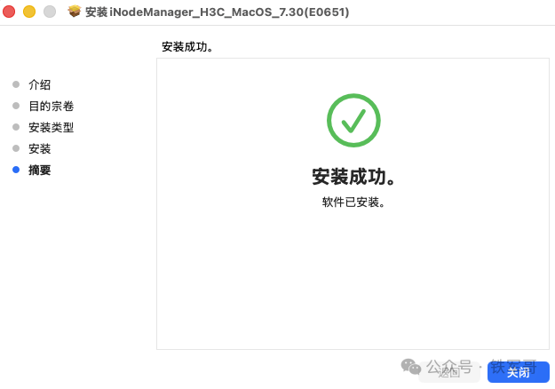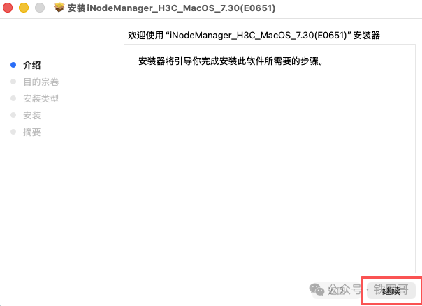 接下来,开始安装。首先,我们双击运行iNodeManager_H3C_MacOS_7.30(E0651).pkg,进入iNode管理中心安装程序。