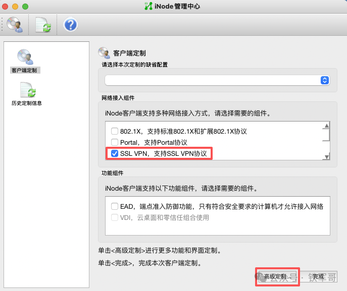 进入到熟悉的iNode管理中心页面,默认就是【客户端定制】选项,在网络接入组件部分,我们仅保留【SSL VPN】即可,然后单击【高级定制】。