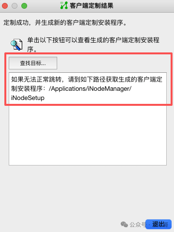 生产完成之后,单击【查找目标】可以快速找到安装文件;如果不小心误退出了,可以直接到/Applications/iNodeManager/iNodeSetup目录下查找。