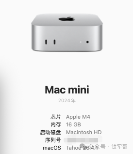 虽然处理器是上一代的Apple M4芯片,但系统已经是最新的Tahoe 26.4.1版本。