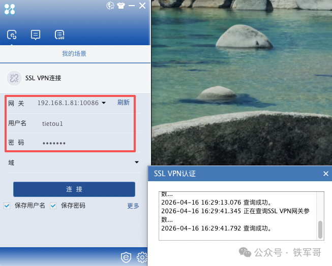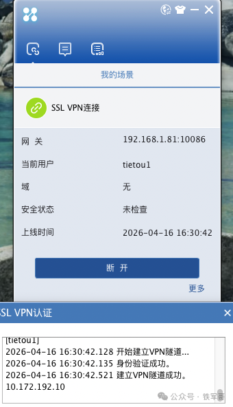 登录时,有一个单独的认证提示框,显示了我们的认证过程,还有获取到的VPN网卡地址信息。看着日志里滚动的“建立VPN隧道成功”,那一刻仿佛打通了任督二脉,内网资源尽在指尖。