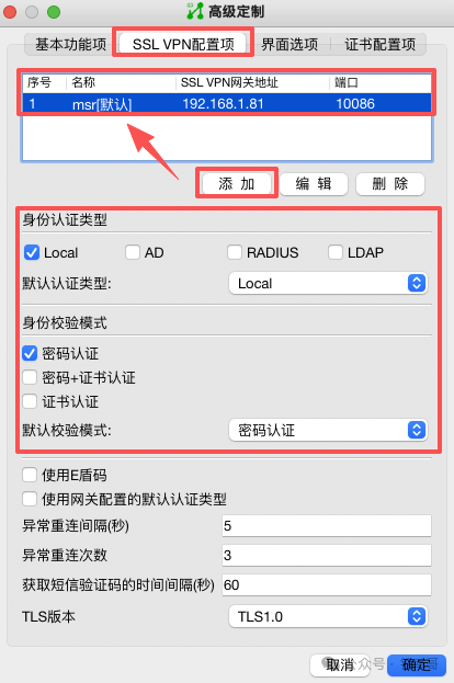身份认证类型和身份校验模式根据实际情况进行调整,我这里用的本地密码认证,所以身份认证类型选择【Local】,身份校验模式选择【密码认证】;如果你的SSL VPN网关对接了外部认证服务器(如Radius)(免费又专业!FreeRADIUS对接H3C无线网络,完美实现Portal认证),则需选择其他对应选项。调整之后单击【确定】返回定制页面。