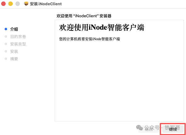在引导欢迎页面,直接单击【继续】开始安装iNode智能客户端。