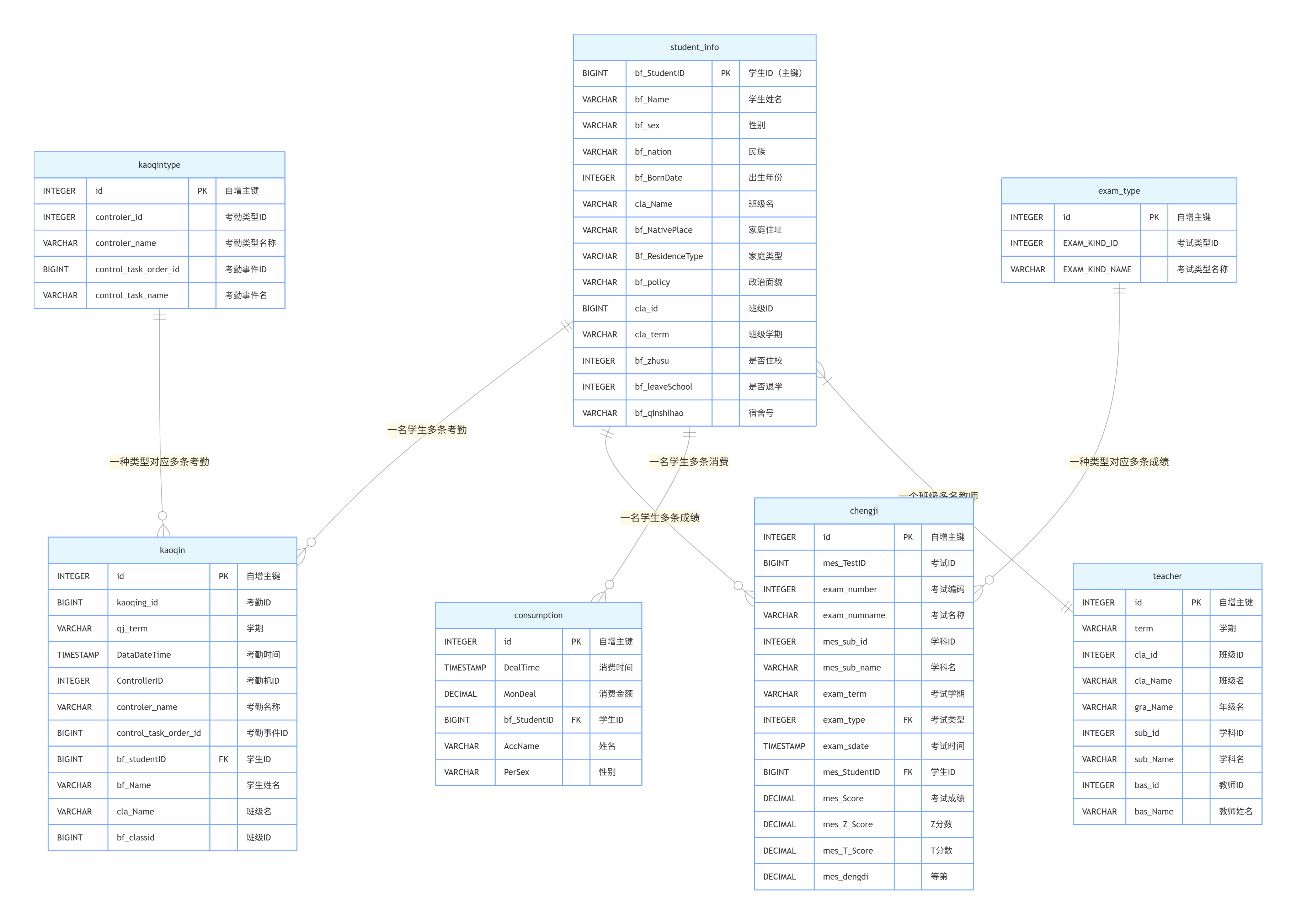 项目根目录/ ├── data/ │ ├── 1_teacher.csv │ ├── 2_student_info.csv │ ├── 3_kaoqin.csv │ ├── 4_kaoqintype.csv │ ├── 5_chengji.csv │ ├── 6_exam_type.csv │ └── 7_consumption.csv └── main.py # 主程序文件