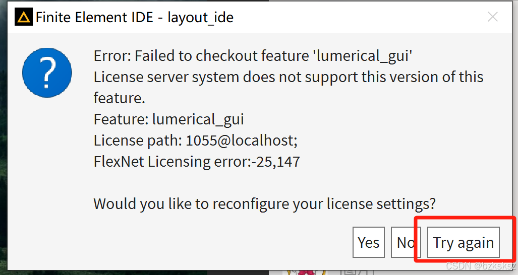 Lumerical FDTD安装完成,启动时报错(许可有问题?)p 在使用 lumerical 时 可能会出现软件在启动时弹出以下提示 导致不能正常使用 p 错误代码 Error Failed to checkout feature lumerical gui License server system does not