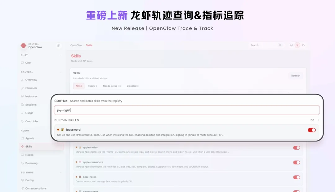 其中,最引人瞩目的当属“OpenClaw X 京东物流”的深度结合。在Claw Hub搜索Joy-logistics安装,即可拥有一个“AI数智化运营官”,支持查询包裹轨迹及运营关键数据,让全链路的物流动态及整体运营质量尽在商家掌握之中。