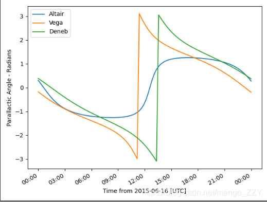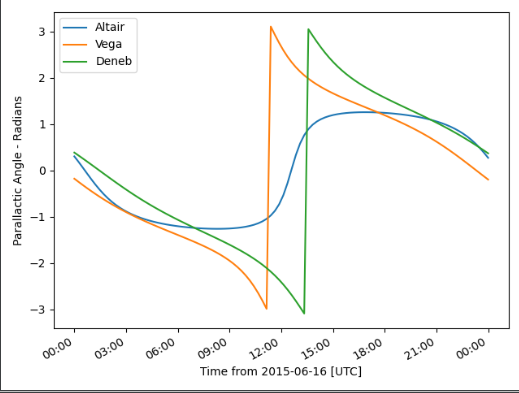 import matplotlib.pyplot as plt from astroplan.plots import plot_parallactic plot_parallactic(altair, subaru, time) plot_parallactic(vega, subaru, time) plot_parallactic(deneb, subaru, time) plt.legend(loc=2) plt.show()