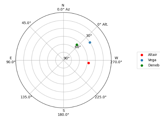 from astroplan.plots import plot_sky import matplotlib.pyplot as plt altair_style = {'color': 'r'} deneb_style = {'color': 'g'} plot_sky(altair, subaru, start, style_kwargs=altair_style) plot_sky(vega, subaru, start) plot_sky(deneb, subaru, start, style_kwargs=deneb_style) plt.legend(loc='center left', bbox_to_anchor=(1.25, 0.5)) plt.show() plot_sky(altair, subaru, end, style_kwargs=altair_style) plot_sky(vega, subaru, end) plot_sky(deneb, subaru, end, style_kwargs=deneb_style) plt.legend(loc='center left', bbox_to_anchor=(1.25, 0.5)) plt.show()