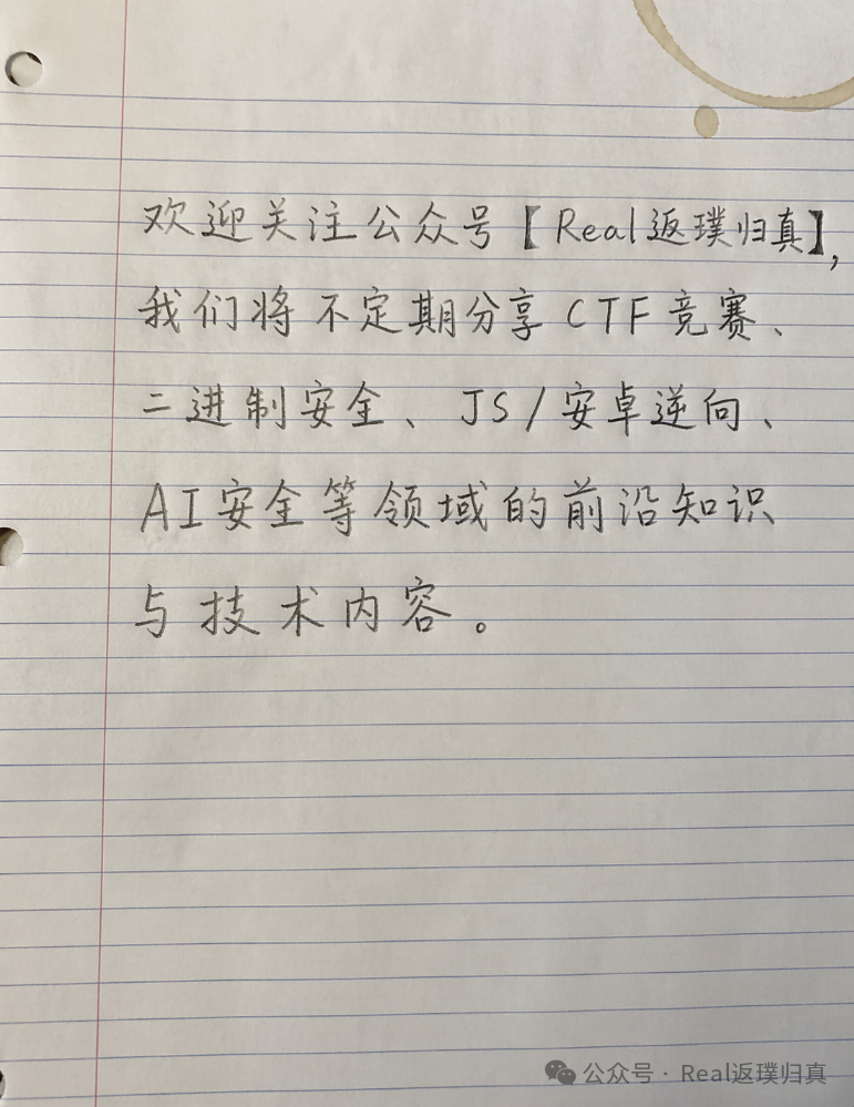 欢迎关注公众号【Real返璞归真】,我们将不定期分享CTF竞赛、二进制安全、JS/安卓逆向、AI安全等领域的前沿知识与技术内容。