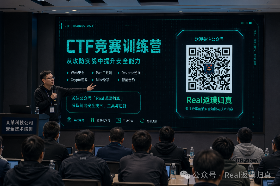 2025年中国网络安全培训课程在现代化的演讲厅举行。我是讲师,一名中国网络安全专家,为来自另一个组织的专业人士教授CTF(夺旗)竞赛培训课程。在我身后的大屏幕上,一张幻灯片以深色主题、霓虹青色和绿**调、黑客风格的排版和微妙的矩阵状网格背景显示。幻灯片推荐了一个微信公众号“Real”返璞归真’ 并包含一个二维码——使用我上传的附件中的二维码。整个场景逼真,演示者和屏幕上的灯光聚焦,营造出专业而前卫的“黑客”美学。