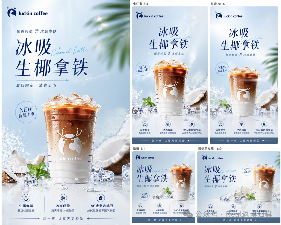 为瑞幸咖啡的新品“冰吸生椰拿铁”制作一则广告图片。 图片中应包含一杯冰镇的生椰拿铁,杯壁有水珠,带有清凉薄荷感,场景明亮清新,夏日风格。整体风格现代、年轻、带一点未来感,融入中国街头潮流美学——线条简洁,主色调为浅蓝和白色,搭配霓虹点缀,呈现酷感都市氛围。饮品看起来清爽、冰凉、充满活力。加入微妙的“冰感”视觉元素(如冰晶、冷雾或蓝色渐变光晕)。请提供多种宽高比,适用于微信朋友圈、小红书(3:4)、抖音(9:16)和微博(1:1)。