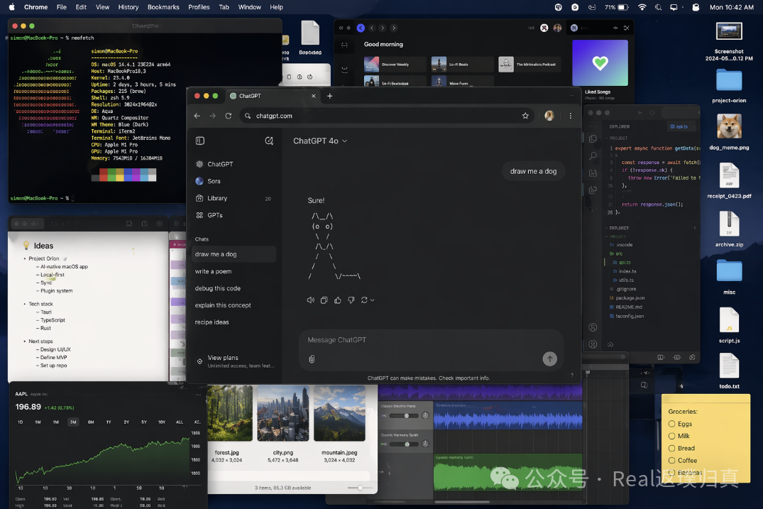 a screenshot of chatgpt, in a browser, in macosx. the user types “draw me a dog” chatgpt draws an ascii dog the front window is chatgpt, but the desktop is quite messy with lots of random windows open (e.g. a terminal). they’re all in the background