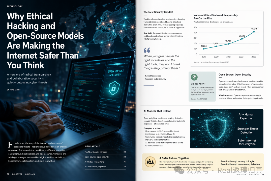 an editorial magazine page about why ethical hacking and open-source models are making the internet safer than widely believed. make it look like a glossy, smooth, well laid out widely distributed science magazine.