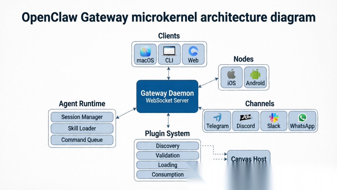 ┌─────────────────────────────────────────────────────────────┐ │ OpenClaw Gateway │ │ (单进程守护进程) │ ├─────────────────────────────────────────────────────────────┤ │ WebSocket Server (默认 127.0.0.1:18789) │ ├──────────┬──────────┬──────────┬───────────────────────────┤ │ Clients │ Nodes │ Channels │ Agent Runtime │ │ (macOS/ │ (iOS/ │ (WA/TG/ │ (pi-agent-core) │ │ CLI/Web)│ Android)│ Slack/ │ │ │ │ │ Discord)│ ┌───────────────────┐ │ │ │ │ │ │ Session Manager │ │ │ │ │ │ │ Skill Loader │ │ │ │ │ │ │ Command Queue │ │ │ │ │ │ │ Compaction Engine │ │ │ │ │ │ └───────────────────┘ │ ├──────────┴──────────┴──────────┴───────────────────────────┤ │ Plugin System (4层: 发现→验证→加载→消费) │ │ Capability Registry (Provider/Speech/Image/Channel...) │ ├─────────────────────────────────────────────────────────────┤ │ Canvas Host (HTTP Server) │ └─────────────────────────────────────────────────────────────┘