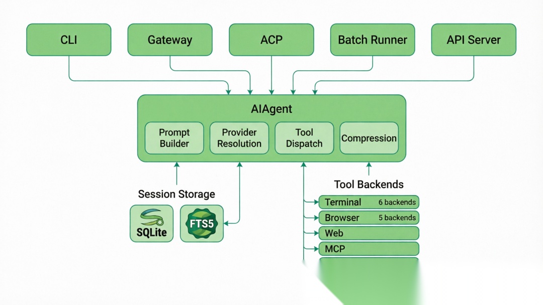 - Platform-agnostic core:一个AIAgent类服务于CLI、Gateway、ACP、Batch和API Server。平台差异存在于入口点,而非Agent本身。
