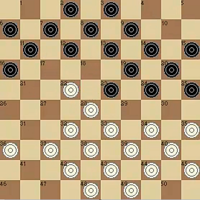 在大多数国家国际跳棋为64格,规则有所不同,有巴西规则、俄罗斯规则等。但国际比赛采用的棋盘为100格,此外加拿大国际跳棋采用12*12即144格的棋盘,棋盘越大,变化越丰富,难度也相应增大。如图所示,国际跳棋棋子是圆柱型的,黑白棋子各二十枚,棋子表面上有罗纹,这种棋子叫“兵”,把兵翻过来(或两兵叠起来)就是“王”。由于棋子只能在深色格子中行走,因此可以将这些格子依次编号,方便记录棋局。对于100格国际跳棋,开局时,黑色棋子分布在1至20格,白色棋子分布在31至50格,和国际象棋类似,白棋先行。