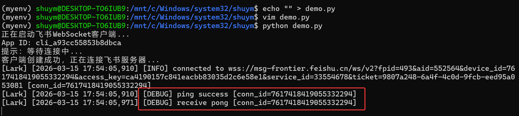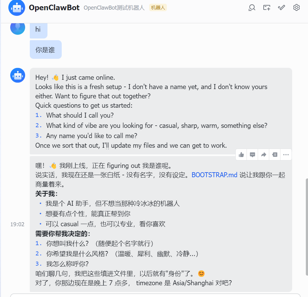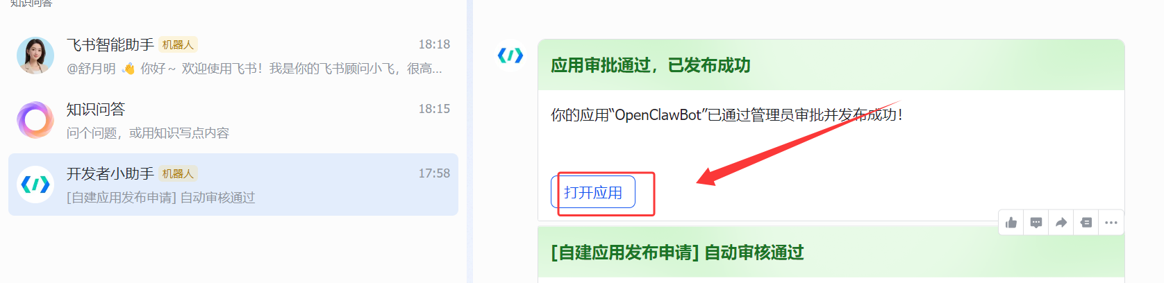 - 第二步:发送测试消息,在飞书中找到您创建的机器人,发送一条消息