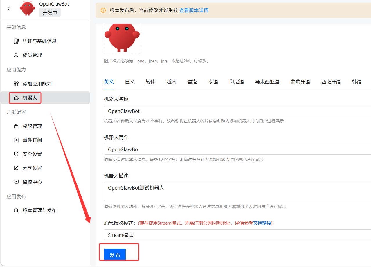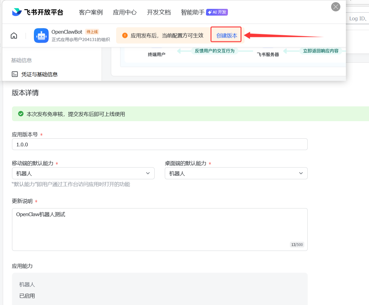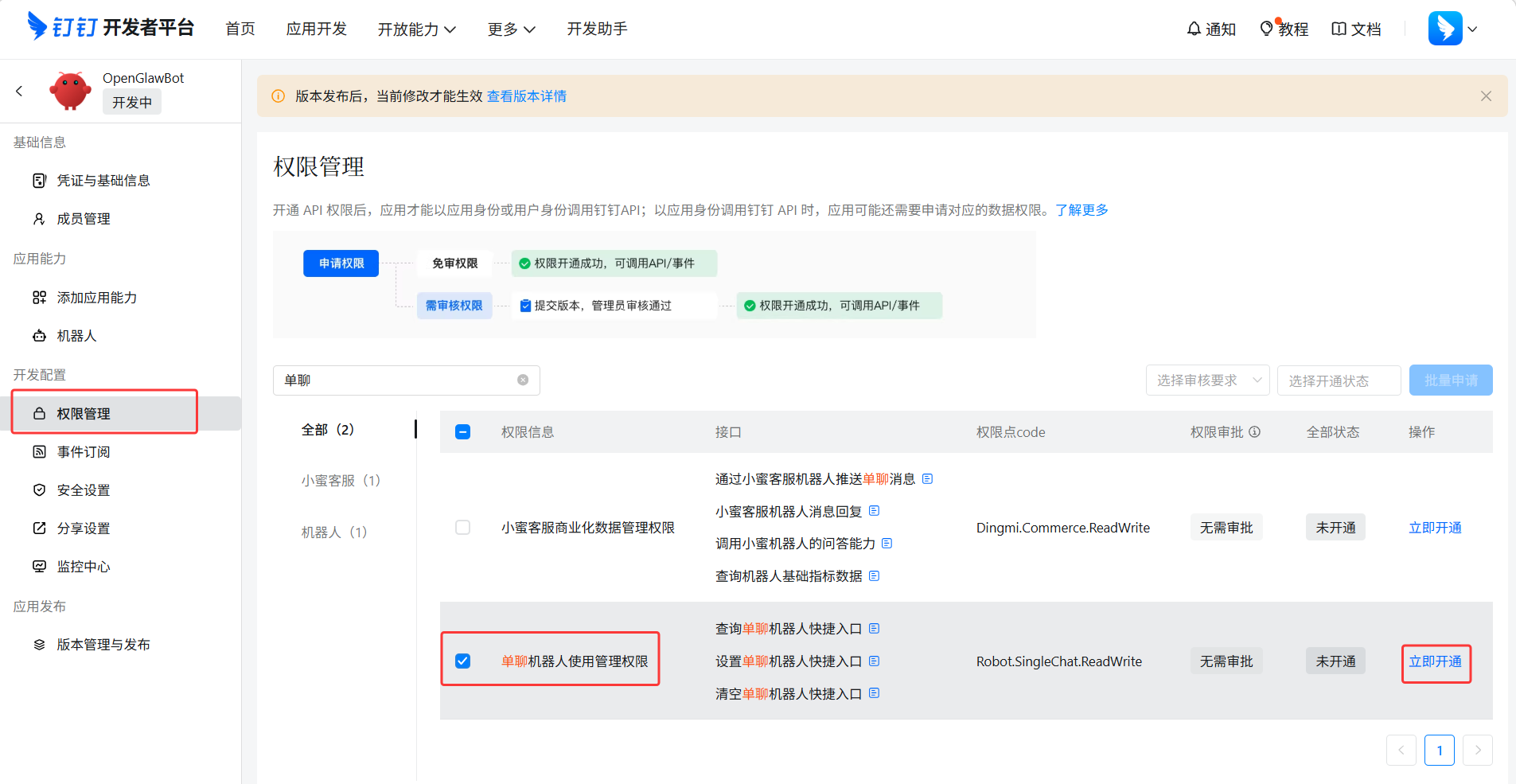 - 第六步:启用机器人能力权限→单聊机器人使用管理权限→立即开通